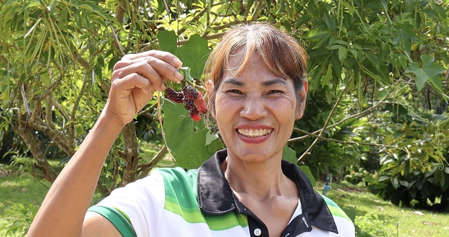 นางชดช้อย แสงทอง สมาชิกวิสาหกิจชุมชนฯ เล่าว่า “เป็นแม่เลี้ยงเดี่ยว ทำงานรับจ้างรายวัน หาเงินเลี้ยงลูก 3 คน ได้บ้างไม่ได้บ้าง สิ้นหวังไม่มีงานไม่มีกิน คิดว่าชาตินี้ไม่น่าจะมีบ้านและที่ทำกินแล้ว เมื่อได้โอกาสร่วมโครงการฯ ตอนแรกกลัวโดนหลอกมากแต่เมื่อเข้าร่วมแล้วปรากฏว่าทุกอย่างคือความจริง ทำให้ชีวิตมีความหวังเห็นแสงสว่างดีใจมาก วันนี้มีความสุขมาก ๆ ตอนนี้ทำสอนปลูกผัก ผลไม้เกือบทุกชนิด เลี้ยงปลาในกระชัง ทำเกษตร แม้จะยากและเหนื่อย แต่คิดว่าถ้าสู้เราทำได้ อยากให้ทุกคนมีความหวัง ”ธนาคารที่ดิน“ ช่วยเราได้จริง ๆ